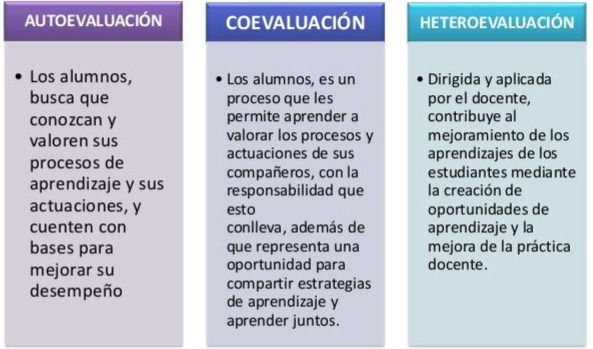 Heteroevaluación: en esta evaluación se hace referencia a aquellos procesos de evaluación realizados por personas distintas al estudiante o sus iguales. Pueden evaluar las familias, otros docentes u otros